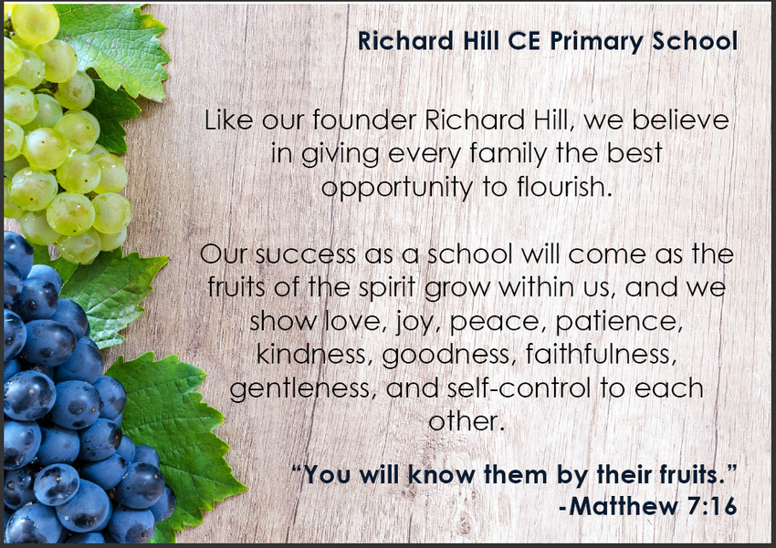 The Christian Vision for Richard Hill "You will know them by their fruits." was developed with the whole school community in Autumn 2020. The Fruits of the Spirit are the values that work alongside this vision. They are listed above. Our Vision and our Values work closely together.